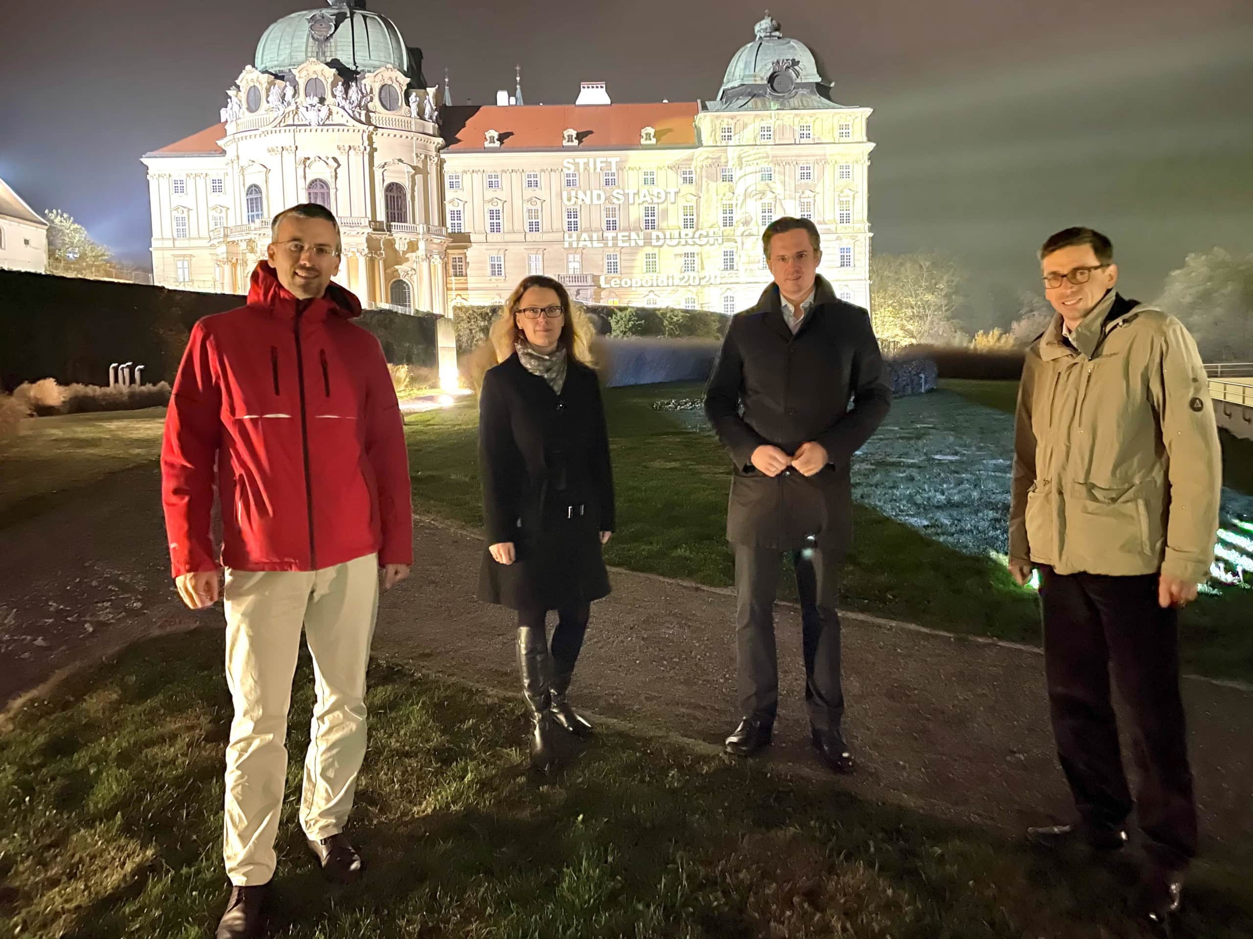 Bildtext: V.l.: Vizebürgermeister Mag. Roland Honeder, Karin Rezac von Rezac High Power Projection, Bürgermeister Mag. Stefan Schmuckenschlager und Mag. Andreas Gahleitner, Wirtschaftsdirektor des Stiftes Klosterneuburg.