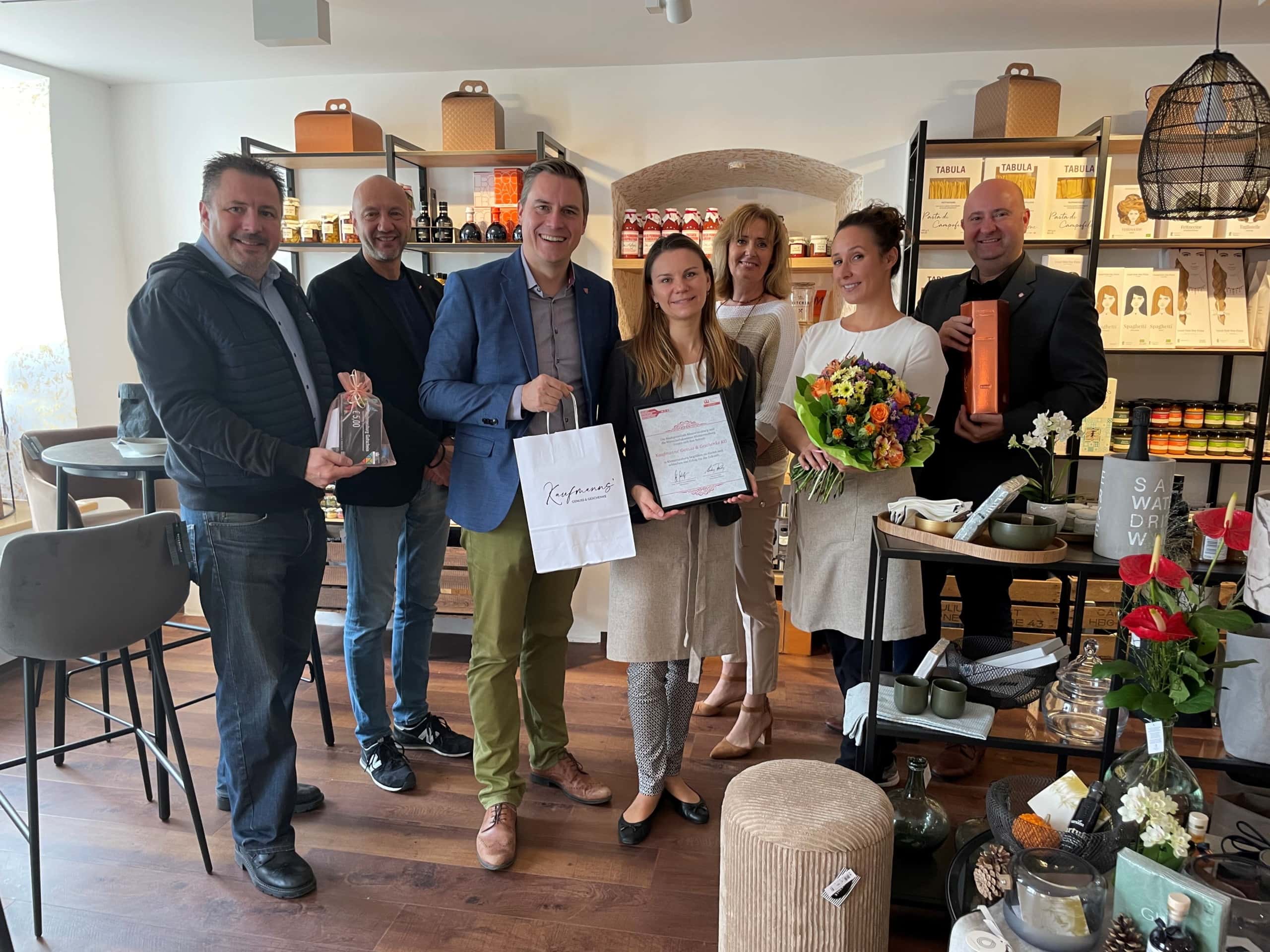 WK-Obmann Markus Fuchs und WK-Leiter Friedrich Oelschlägel , Martina Polndorfer (Frau in der Wirtschaft) sowie LAbg Christoph Kaufmann und Stefan Gabritsch (Stadtmarketing) gratulierten der Neugründerin mit einer gemeinsamen Urkunde der Wirtschaftskammer und der Stadtgemeinde Klosterneuburg und wünschen weiterhin viel Erfolg.