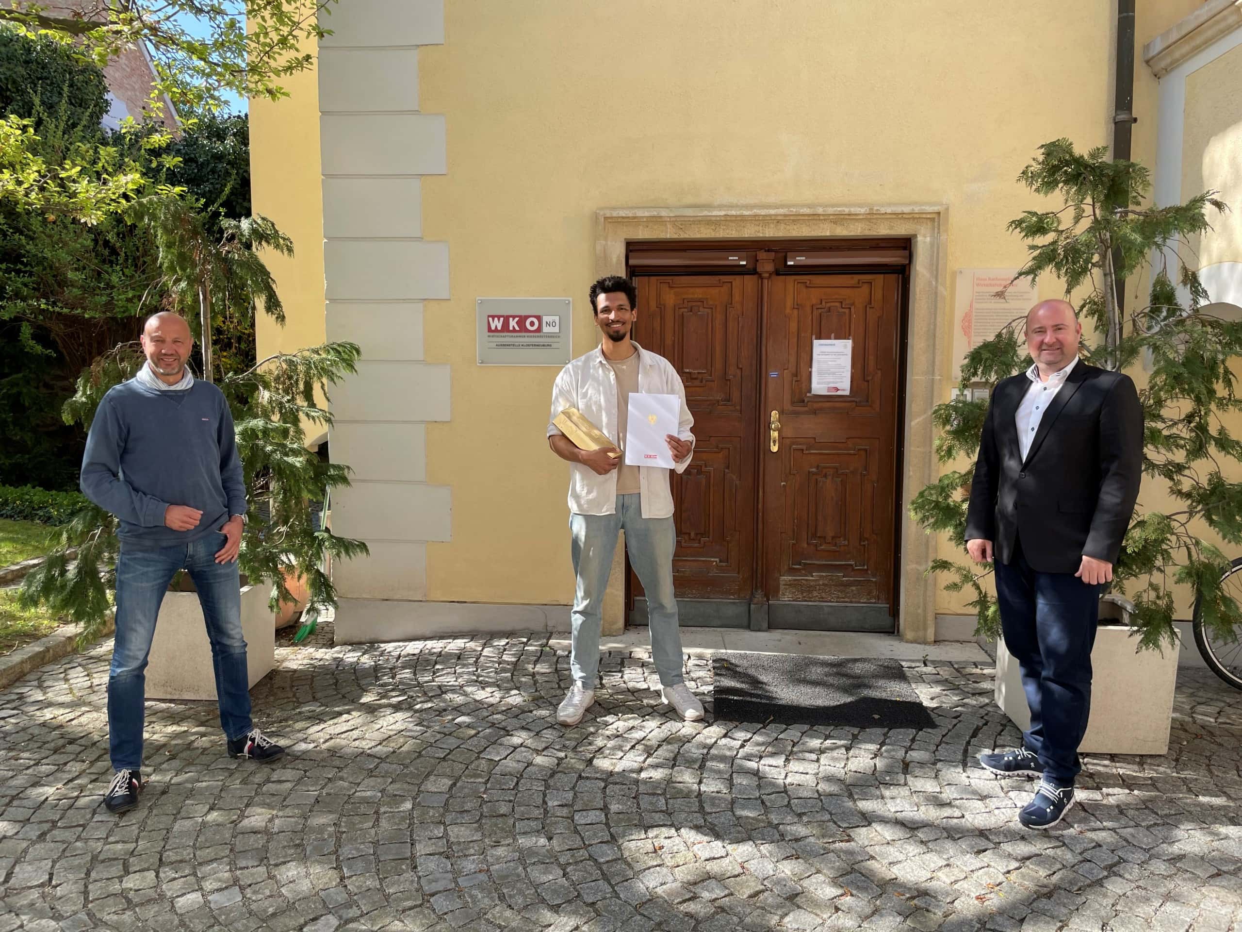 WK-Obmann Markus Fuchs und WK-Außenstellenleiter Friedrich Oelschlägel gratulierten dem Jungunternehmer zur Unternehmensgründung und wünschten ihm viel Erfolg für die Zukunft!
