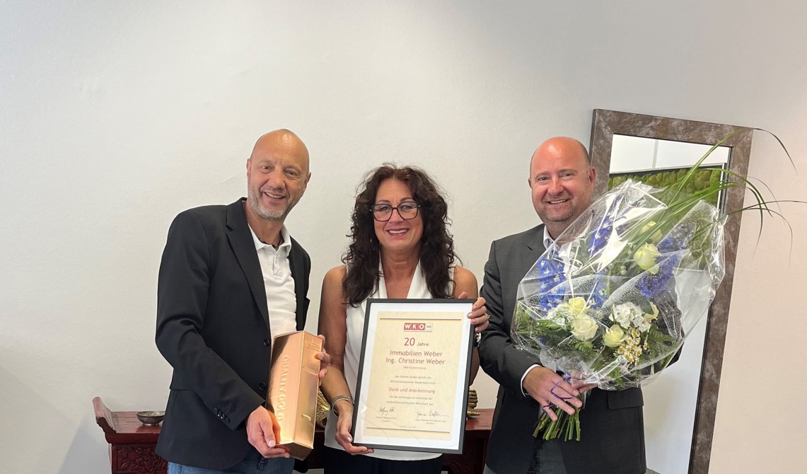 WK-Außenstellenobmann Markus Fuchs und WK-Außenstellenleiter Friedrich Oelschlägel besuchten Christine Weber an ihrem neuen Standort im Büropark Donau in der Inkustraße, gratulierten zum 20-jährigen Firmenjubiläum mit einer Urkunde und wünschten ihr und ihrem Team weiterhin viel Erfolg. Weitere Infos findet man unter: https://www.i-w.at/
