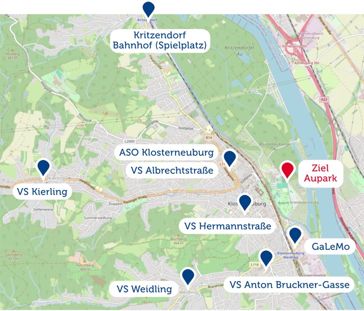 • 13 Uhr Treffpunkt & Start bei den Volksschulen, bei der ASO Klosterneuburg & beim Bahnhof Kritzendorf